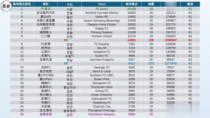 韩国K1与K2联赛上座东谈主数总名次: FC首尔第一, 金泉尚武垫底