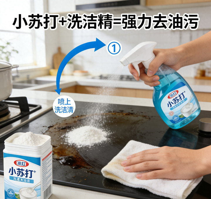 厨房重油污无用愁,小苏打+洗洁精即是神器。将两者按1:1搀杂,加少许温水调成糊状,涂抹在油烟机、灶台油污处,静置10分钟后用抹布擦抹,订立油污一擦即净,比专用去油剂更安全无残留,擦完还能幸免台面留水渍。