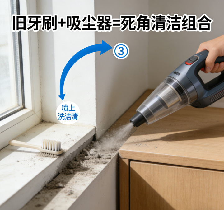 边缘灰尘难计帐,旧牙刷+吸尘器组合超实用。窗台过失、键盘按键、产品边角的灰尘,用旧牙刷蘸少许净水轻刷,再用吸尘器吸走碎片,死角污垢全清空,旧牙刷改良后比专用清洁刷更纯真。